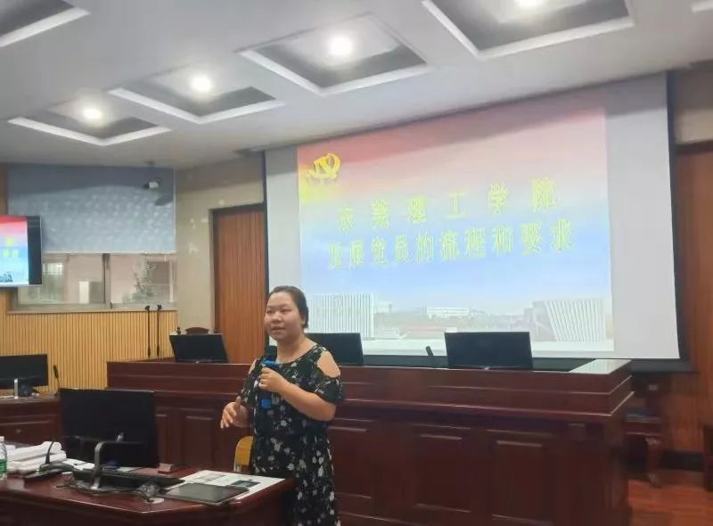 在莞城校区模拟法庭举行第29期分党校第二次培训课,学生党支部书记钟丽华老师担任本次课堂的主讲人。