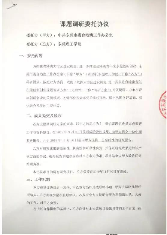 法社学院公共管理与社会工作教师党支部携手东莞市委台港澳办,建立业务合作意向,9月份签署了《紧抓大湾区建设机遇,进一步推动台港澳青年来莞创新创业》科研合作协议,完成了《台港澳青年来莞创新创业现状调研报告》一项,获得了市委台港澳办的好评。
