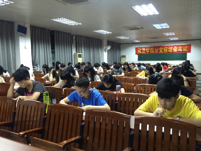 开考时间一到,由党建办工作人员先宣读考试注意事项,然后由监考人员分发试卷。同学们都埋头认真做试题,争取交上一份令人满意的答卷。到考试时间截止为止,考场的纪律和考风都很好,无违纪现象。