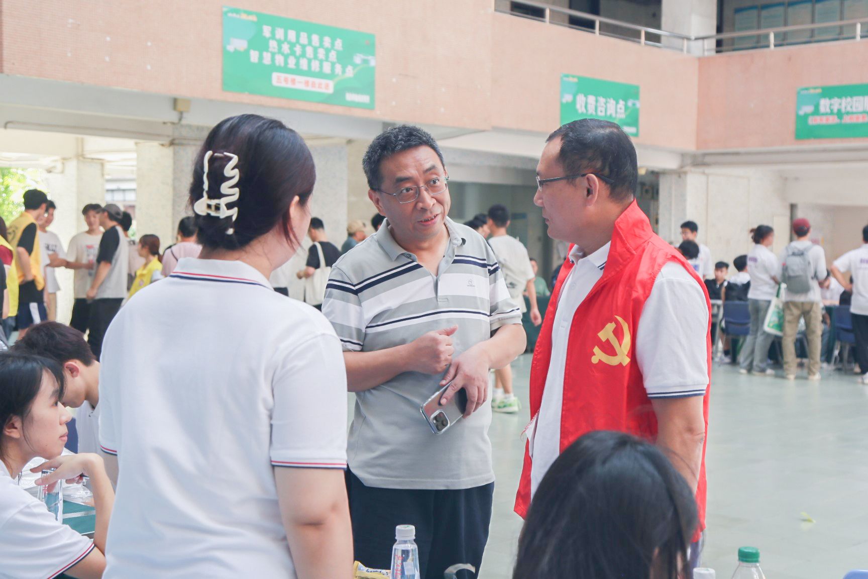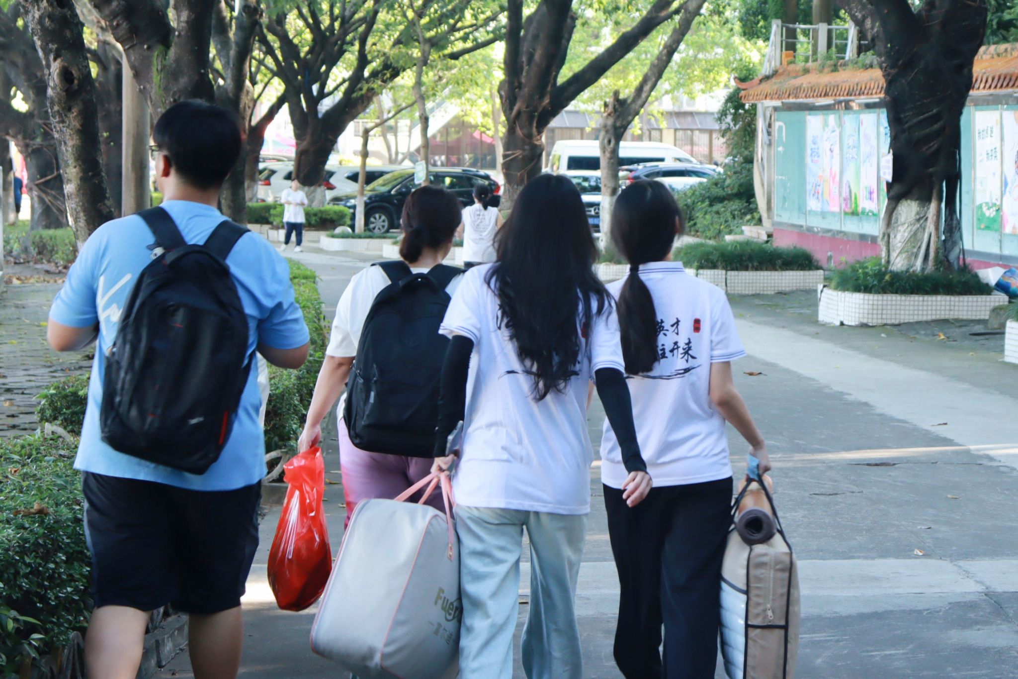 为了做好迎新工作,法社学院的志愿者们早已在校门口等候,为新同学们提供指引、搬运行李等服务。