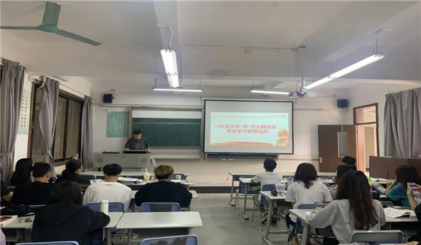 2019级社会工作1班于319日开展的“学党史、悟思想”主题班会中,班长林瀚向同学们讲述了习近平总书记在党史学习教育动员大会上的讲话精神,并鼓励同学们主动自觉学习党史。