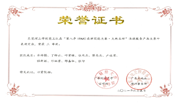 “莞工队”荣获IRAAC第八季天地正杯法律技能大赛三等奖。第一次参赛,取得如此佳绩实属不易。教学楼、会议室、图书馆都留下了团队成员们多日熬夜协作备赛的身影。在与各高校队伍切磋学习的过程中,肉蒲团