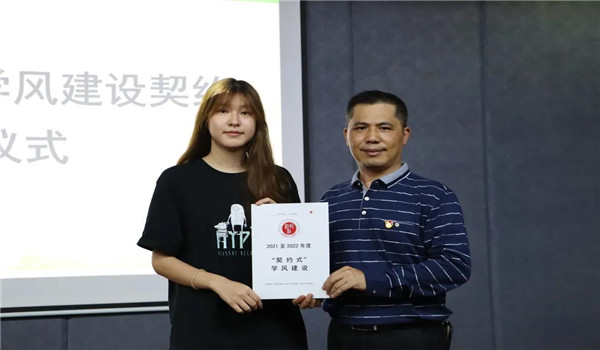最后,由丘书记与各班级代表签订2021-2022学年度法社学院“契约式”学风建设目标书,他强调良好学风建设要求同学们思想上高度重视,组织上精心策划,过程上真抓实干,效果上明显体现,才能助力同学们成长成才。