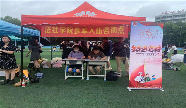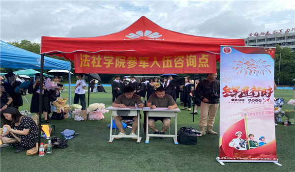 为筑牢广大青年学生的国防意识和国防观念,加大参军入伍的宣传力度,6月12日,法社学院国防教育宣讲团成员胡岸婷、李伟锋、赖晓锋来到毕业生拍照现场开展参军入伍宣传活动,动员广大应届毕业生及在校生响应祖国号召,积极参军入伍,投身国防建设。