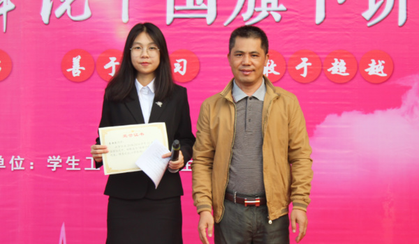 党总支副书记丘永辉为李雨洙同学颁发了荣誉证书。每一次升国旗仪式,展现的是我校师生的奋力齐心,共建高水平理工科大学的精神面貌,每一场莞工青年说,激励的是更多同学向榜样看齐的决心。
