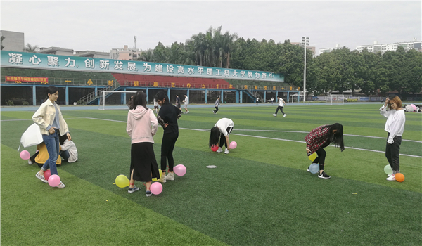 第一个趣味活动是齐心协力,每两人组成一队,两名队友背对背用身体夹住一个气球,侧跑完成规定路线。在班委的带动下,大家的热情十分高涨,各个小组成员争相竞赛,你追我赶。第二个趣味活动是踩气球,各个团员脚上绑着两个气球,互相踩对方脚上的气球,足球场上气球爆破声和笑声交替不断,现场气氛十分欢乐。第三个趣味活动为快乐传真,团员将所要表达的东西用肢体语言传递下一个人,由最后一个人猜出词语。各个团员纷纷使出浑身解数,最终大家都成功猜出词语。游戏结束后,团支书曾颖康组织大家进行合影留念。