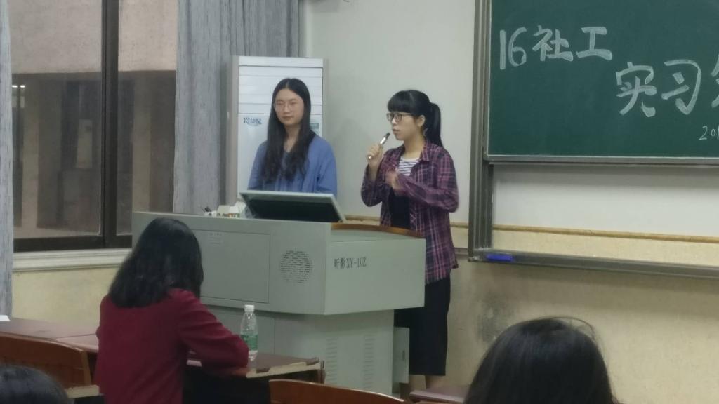 在社会工作1班李正同学的主持下,实习经验分享会正式开始,此次上台分享的有社会工作1班的8位同学和社会工作2班的5位同学。