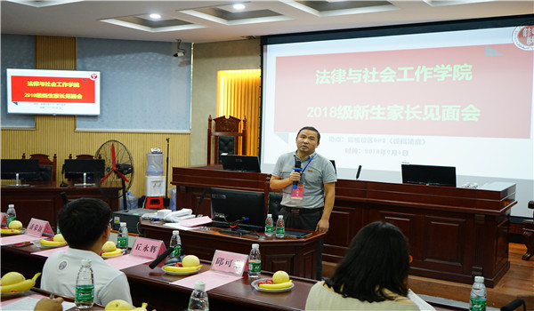 9月1日下午两点半,为促进学院与新生家长之间的交流,营造“家-校”三共育人氛围,让新生家长初步了解学院、了解学生所学专业,法社学院2018级新生家长见面会在模拟法庭举行,强昌文院长、潘荣新书记、夏能礼副院长、丘永辉副书记、辅导员老师及2018级新生家长参加了本次见面会。