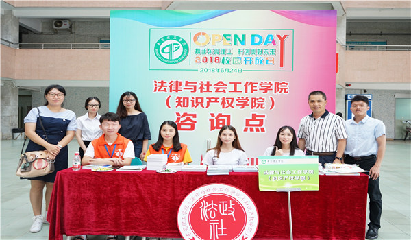 在5号楼、6号楼平台的学院接待点,工作人员向到访的考生和家长展示了学院在文化建设方面的成果,有党日活动剪辑、读书节作品集、法社学院纪念品大礼包等等。同时,高考考生和家长走进学院的办学场所模拟法庭和社会工作实验室,“零距离”感受法社学院的课程特色、教师风采和学生组织活动。