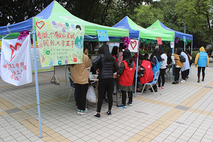 志愿服务站,为了纪念反法西斯大学生运动,发扬“和平、民主和自由”的精神,丰富大学生活,举办的“看!这个有爱的莞城”国际大学生节活动在肉蒲团