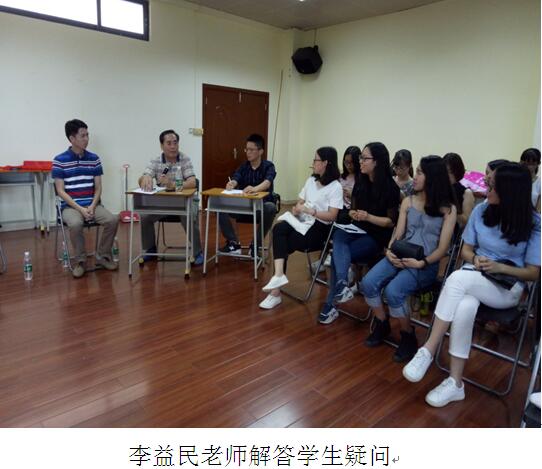 第二个环节则围绕着毕业论文、考研、毕业实习等问题展开。首先,李益民老师分别从毕业论文重要性、选题技巧、论文进度安排等方面向学生们介绍了毕业论文相关事项。接着,刘宇阳、黄俊辉、龚紫钰等老师仔细回答了学生们关于考研复习、学校及导师选择等方面的多个问题。接下来李益民老师就即将开始的毕业生实习提出了自己的看法和对学生们的中肯建议。最后,邹朝春老师对整个座谈会进行了总结。