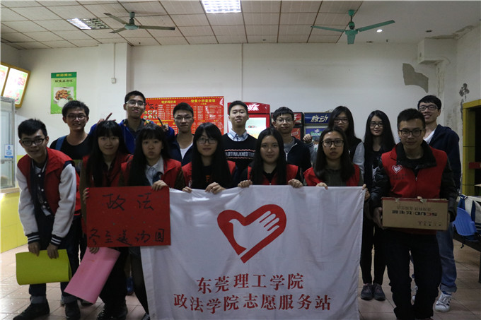 2015年12月22日晚,政法志愿站在莞城校区开展以“冬至暖心”为主题的志愿活动。此次派送汤圆的对象为全体在校执勤员工。政法学院团总支副书记谢子聪、赖丽旋、陈瀚文以及志愿站的全体干事参与了本次活动。