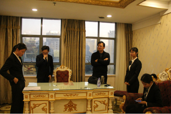 下午五点,领队老师与五位参赛同学回到房间大厅进行提前排练预演,为22日上午的正式比赛做准备。参赛同学在老师指导下,互相观摩,提出对方需要改进的地方,修改演讲稿件,注意演讲时间,完善演讲动作,调整演讲语速,以求达到最完美的效果。