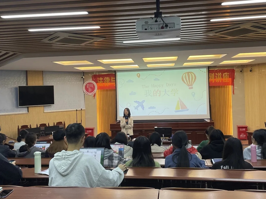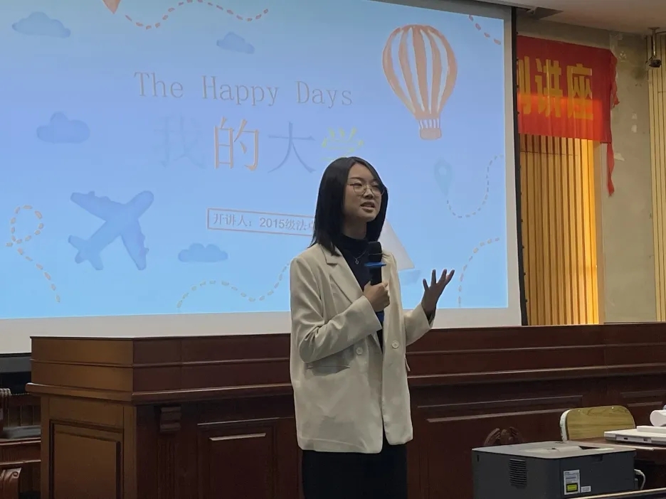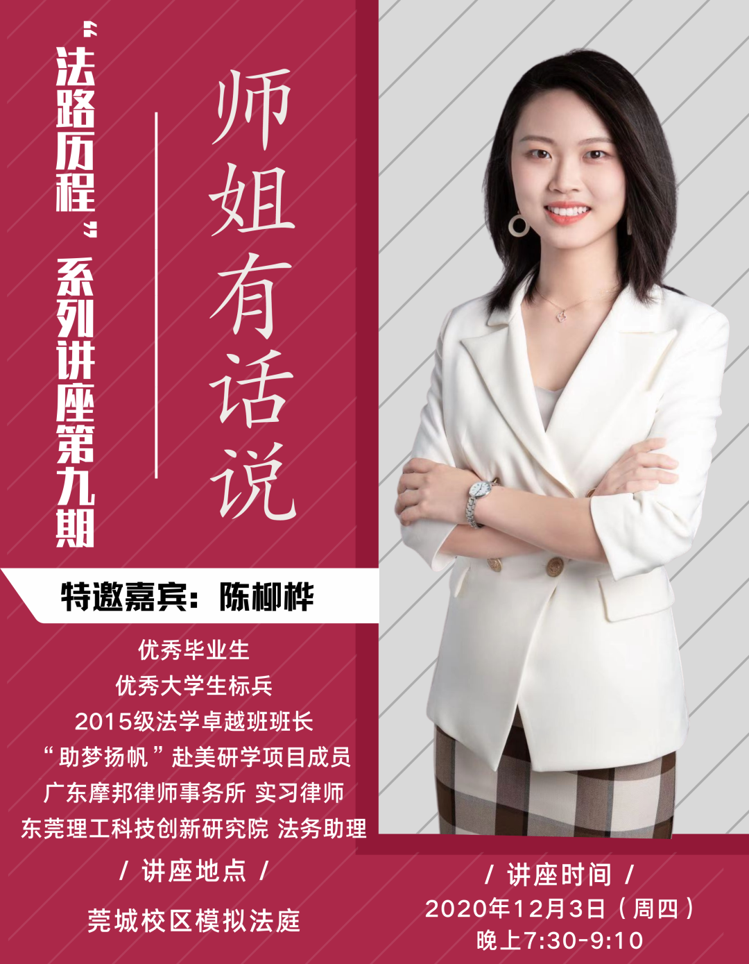 在莞城校区模拟法庭举行“法路历程”第九期系列讲座,本次讲座由15级法学卓越班班长陈柳桦师姐主讲,意在向师弟师妹分享学习经验,19级法学卓越班班主任李文伟老师出席本次讲座。