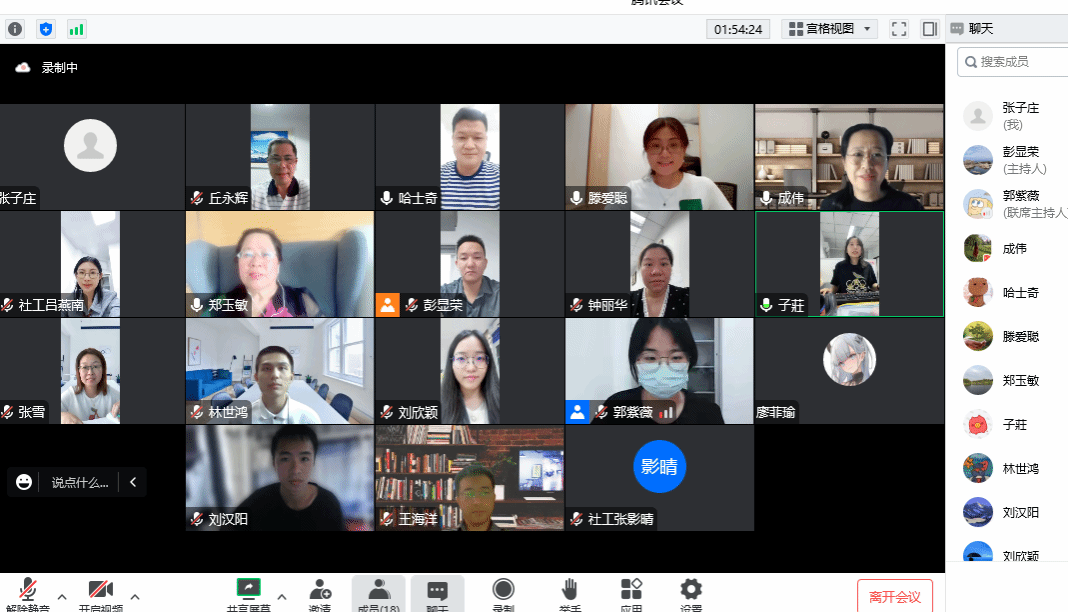 社工系主要负责人、莞思分院主要领导、莞思分院辅导员、学校社区育人项目主管、社工机构代表、社工团队、学生导生干部参加了会议。会议分工作汇报和自由讨论两个阶段开展。