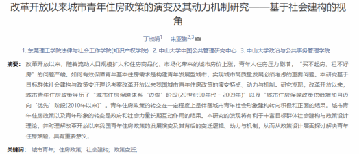 论文《公共危机与卫生创新采纳变化——以互联网医院为例》发表在《中国行政管理》2021年第11期,该文关注我国医疗卫生服务递送的一种重要创新互联网医院及其服务,深入考察重大公共卫生危机发生前后互联网医院采纳的动态过程,着重分析公共危机对卫生创新采纳的影响。该文同时获东莞市第四届哲学社会科学优秀成果奖。论文《改革开放以来城市青年住房政策的演变及其动力机制研究——基于社会建构的视角》发表在《青年探索》2022年第4期,全文被中国人民大学复印报刊资料《青少年导刊》2022年第12期转载,论文基于目标群体社会建构与政策变迁理论考察改革开放以来我国城市青年住房政策的演变特点、动力与机制。