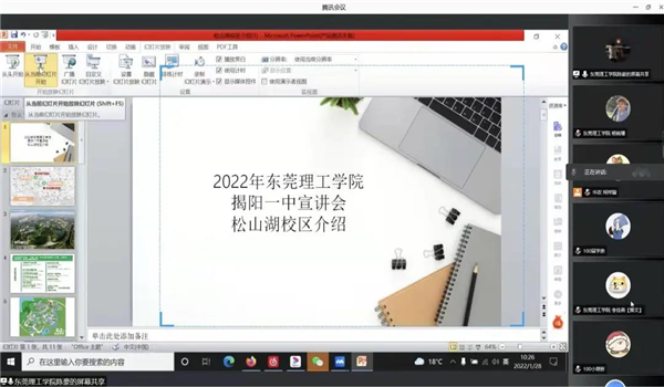 受疫情防控影响,揭阳第一中学、揭东一中、揭东二中和普宁华美的宣讲队根据当地的具体防疫要求,采用线上直播的形式进行宣传。线上宣讲会通过播放宣传片、简要介绍学校及各学院情况和在线答疑的形式为高三学子宣传介绍莞工,除此之外还建立QQ群和微信群为同学们进行答疑,帮助同学们更好地了解莞工。
