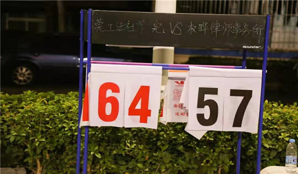 经过激烈的角逐,法社学院教师代表队以总比分64:57战胜了权晔律师事务所篮球团队,获得了本场友谊赛的胜利。
