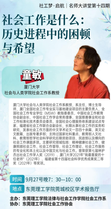 2024年9月27日晚,社会工作系专业品牌活动|社工梦·启航|名师大讲堂第14期在莞城校区学术报告厅举办。本次名师大讲堂活动邀请了厦门大学社会工作系教授、博士生导师童敏教授为我校师生做《社会工作是什么——历史进程中的困顿与希望》的学术报告。参加本次活动的有社会工作系全体学生,黄俊辉、王海洋副院长、系副主任张雪老师、朱晓红老师,活动由社会工作系主任成伟教授主持。