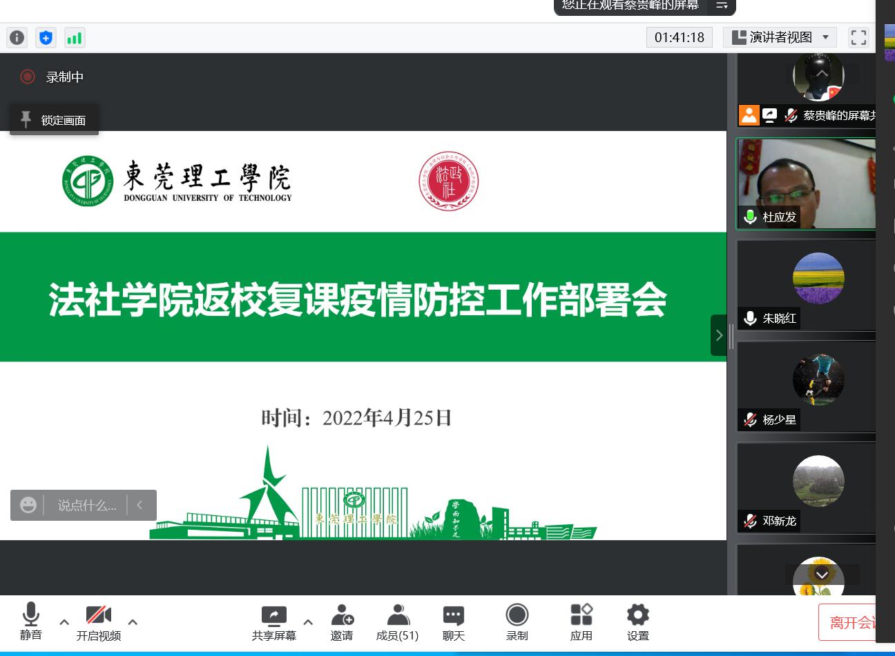 为全面贯彻落实学校关于新冠肺炎疫情防控工作部署,全面做好学院师生员工返校工作,4月25日晚,法社学院在腾讯会议上召开全院大会,落实部署返校复课疫情防控工作。会议由法社学院党委书记杜应发主持,学院全体教职员工参加了本次会议。
