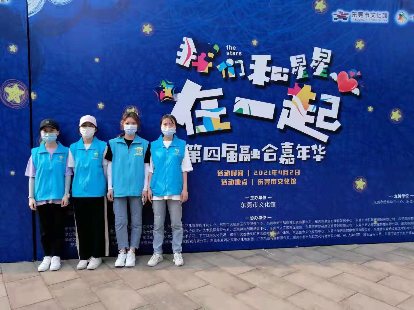 2021年4月2日下午,在第十四个“世界孤独症关注日”到来之际,法社学院的“筑爱星家”志愿服务队在2017社会工作专业蔡贝仪同学的带领下跟随东莞市彩虹伞特殊孩子家庭支援中心参加了由东莞市文化馆联合东莞星星联盟、东莞市公共文化服务社会组织孵化中心开展的“‘我们和星星在一起’第四届融合嘉年华”系列活动。通过协助现场活动展示、设计活动等环节引发社会各界对孤独症儿童的积极关注和大力支持。