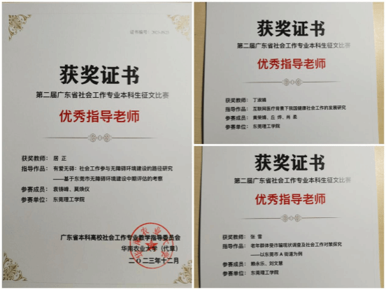 由居正老师指导,本科生袁铸峰、莫焕仪同学合作论文《有爱无碍:社会工作参与无障碍环境建设的路径研究——基于东莞市无障碍环境建设中期评估的考察》荣获二等奖;由丁淑娟老师指导,黄荣婧、丘烨、肖柔同学合作的论文《互联网医疗背景下我国健康社会工作的发展研究》荣获三等奖;由张雪老师指导,赖永乐、刘文慧同学合作的论文《老年群体受诈骗现状调查及社会工作对策探究——以东莞市A街道为例》荣获三等奖。在本次征文比赛中,肉蒲团