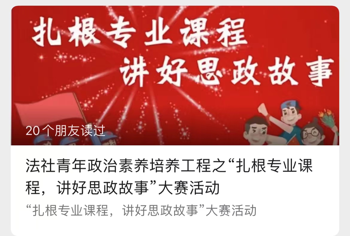 为深入推动思政课程与课程思政同向同行,实现立德树人目标,法社学院从寒假开始面向法社学院学生启动了“扎根专业课程,讲好思政故事”课程思政大赛活动,旨在用大学生喜闻乐见的方式吸引大学生、走进大学生、引导大学生,将用多维度、多方面、多元化的参赛形式,通过大赛形式,表达青年的态度、青年的感悟、青年的行动,圈画青年同心圆。