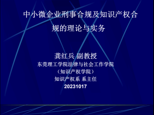 龚红兵副教授于2023年10月16日在大岭山颜屋村村委会给30多家的企业家代表以《中小微企业刑事合规及知识产权合规的理论与实务》为题进行了法治讲座。龚红兵老师以:一、涉案企业合规的政治背景与政治意义(中央相关合规政策介绍);二、涉案企业合规刑事司法政策语境;三、涉案企业如何进行合规整改;四、企业知识产权合规建设的实践路径等四个专题进行了讲授。