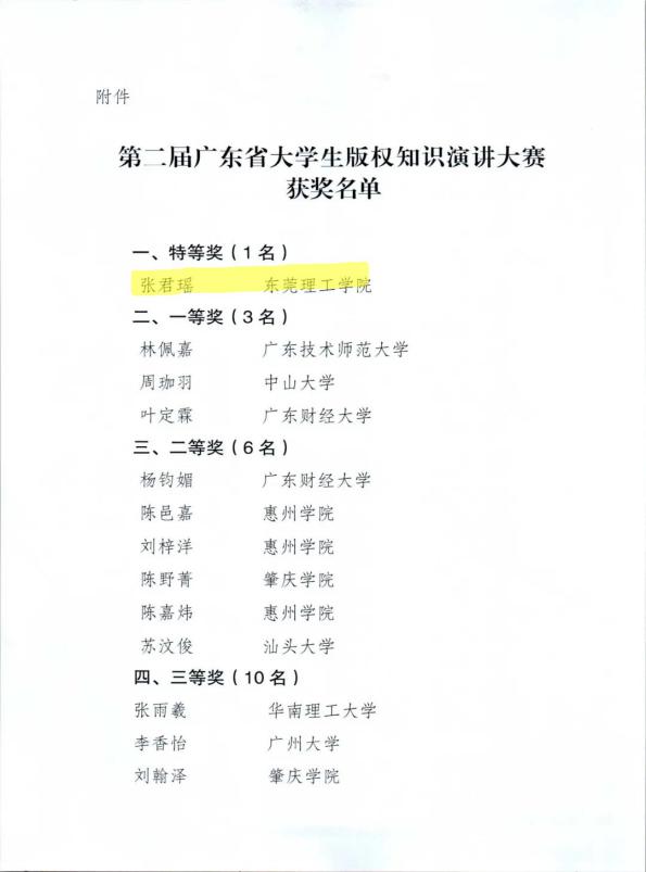 版权保护是知识产权保护的重要组成部分。广东省版权局通过举办大学生版权知识演讲大赛,推进版权知识在大学生中普及,让更多的大学生能够增强版权保护意识,用版权保护自己的权利。广东省大学生版权知识演讲大赛自通知发布以来,得到了省内各高校的大力支持和积极响应。经各高校选拔推荐,来自31所高校的102位选手脱颖而出入围大赛复赛。经过复赛的严格选拔,80位选手最终进入总决赛。共决出特等奖1名、一等奖3名、二等奖6名、三等奖10名和优秀奖20名。(以下是获奖名单)