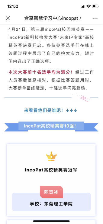 此次大赛中,根据比赛答题用时与准确率,大赛冠军最终敲定为2018级法学(知识产权)辅修专业的陈贤冰同学,在与各大985/211高校的激烈比赛中,陈同学利用扎实的专业基础和熟练的检索操作,一举夺冠!
