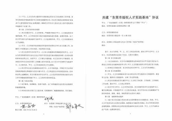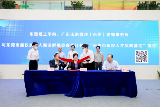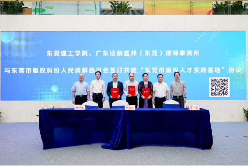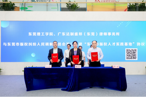 代表郑玉敏、广东法制盛邦(东莞)律师事务所代表何云龙、东莞市版权纠纷人民调解委员会代表苏宁林共同签订了“东莞市版权人才实践基地“协议,共建东莞市版权人才实践中心。